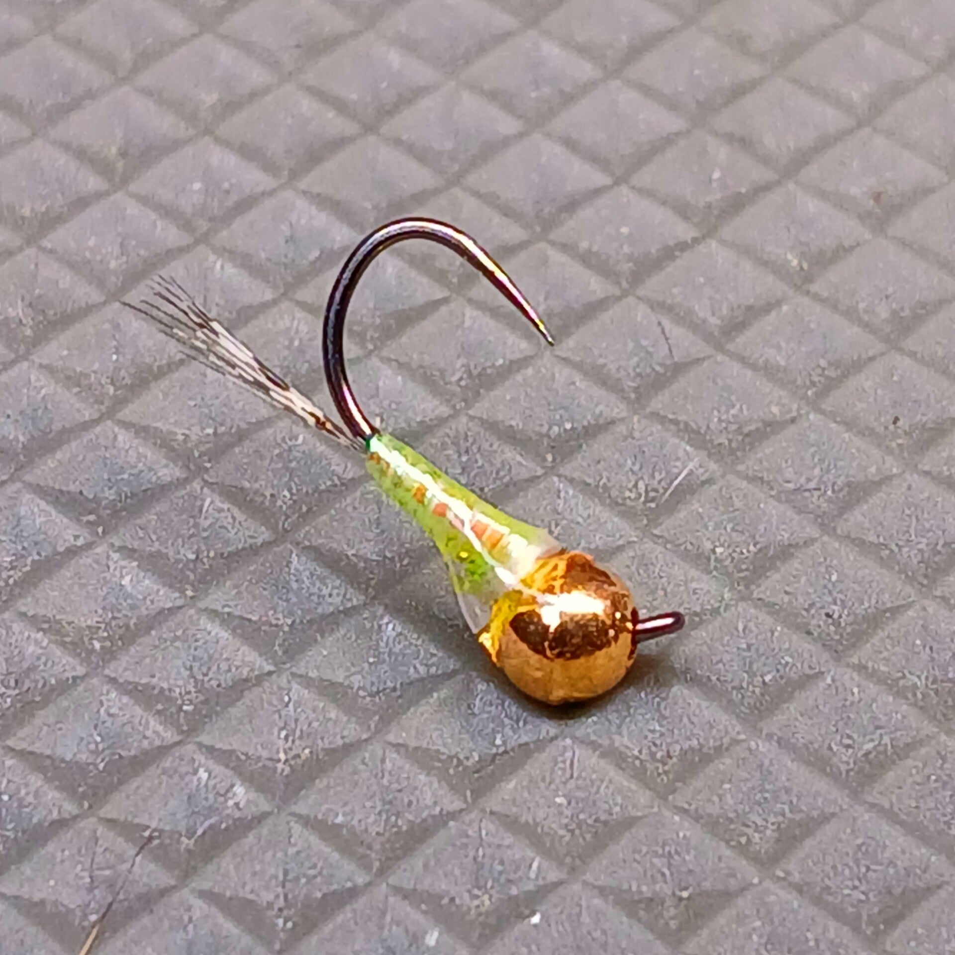L'association bille or + abdomen translucide chartreux donne une nymphe très lumineuse, particulièrement efficace sur les truites et ombres actifs dans les courants...